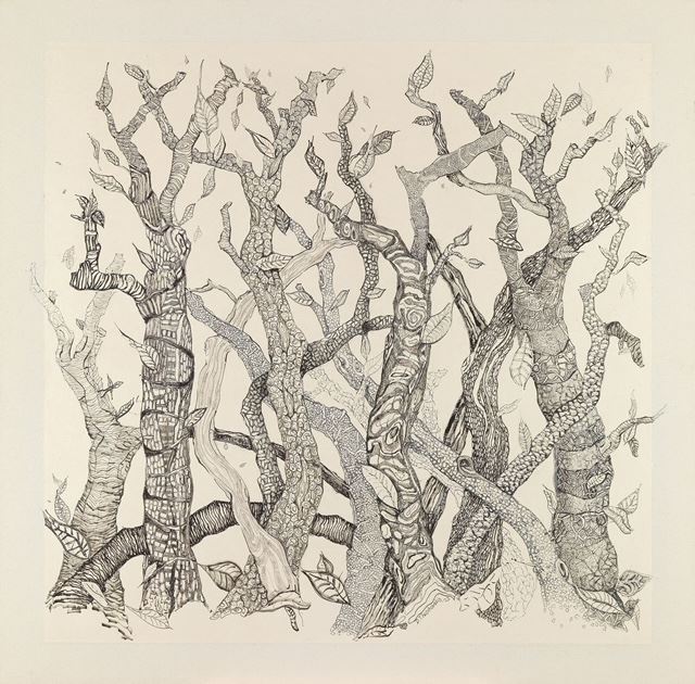 Στο επίκεντρο της νέας της καλλιτεχνικής δημιουργίας βρίσκεται η φύση, μέσα από αρχέγονα, φαντασιακά τοπία δένδρων. Τα δένδρα στην τέχνη της Ντένης Θεοχαράκη αποκτούν ανθρώπινη μορφή. Τα κλαδιά τους περιπλέκονται μεταξύ τους και αποκτούν κίνηση, γίνονται χέρια. Δένδρα με βαθιά χωμένες τις ρίζες τους στη γη που υψώνονται δυναμικά, συνδέοντας τον επίγειο με τον ουράνιο κόσμο.