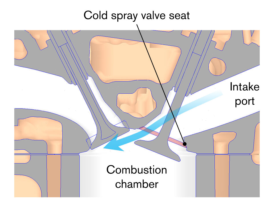 Η νέα έδρα βαλβίδας παράγεται ψεκάζοντας ανόμοιες μεταλλικές σκόνες με υπερηχητική ταχύτητα στην επιφάνεια της κυλινδροκεφαλής αλουμινίου, σχηματίζοντας μια στιβαρή και ανθεκτική επίστρωση που προσκολλάται ισχυρά χωρίς να λιώνει το υλικό της βάσης.