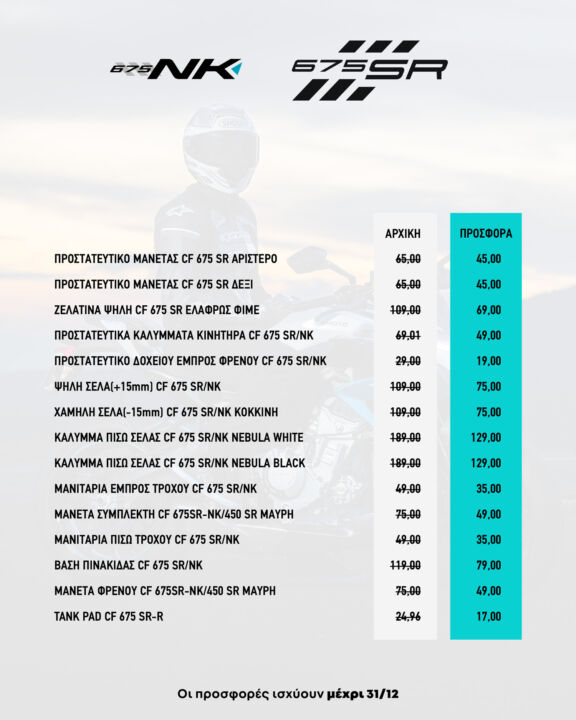 Η CF MOTO ανακοινώνει ότι για ολόκληρο τον μήνα Δεκέμβριο πραγματοποιεί νέα προωθητική ενέργεια, προσφέροντας έκπτωση 30% σε επιλεγμένα αξεσουάρ CFMOTO των παρακάτω μοντέλων: