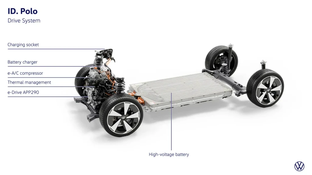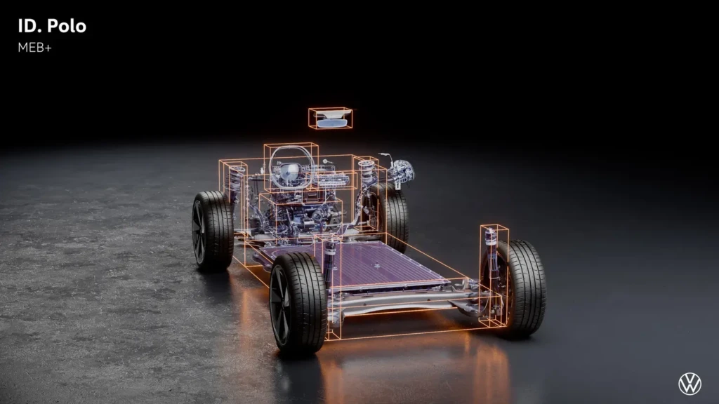 Το ID. Polo διαθέτει ένα νέο σύστημα ηλεκτρικής κίνησης στους εμπρός τροχούς, βασισμένο στην περαιτέρω εξελιγμένη πλατφόρμα Modular Electric Drive Matrix (MEB+).