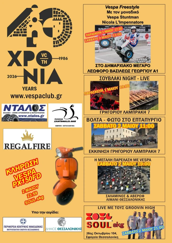 Το Vespa Club Thessaloniki γιορτάζει φέτος τα 40 χρόνια από την ίδρυσή του και διοργανώνει μια τριήμερη επετειακή εκδήλωση για να τιμήσει την ιστορία του και να ανοίξει νέους δρόμους για το μέλλον! Η εκδήλωση “40 χρόνια Vespa Club Thessaloniki” θα λάβει χώρα το τριήμερο 1-3 Μαΐου 2026 στην πόλη μας, υπό την Αιγίδα του Δήμου Θεσσαλονίκης και της Περιφέρειας Κεντρικής Μακεδονίας. Ένα ορόσημο για την ιστορία του συλλόγου και μια γιορτή αφιερωμένη σε όλους όσους κρατούν ζωντανό το πάθος για τη Vespa η οποία φέτος γιορτάζει τα 80 χρόνια από την πρώτη της εμφάνιση!