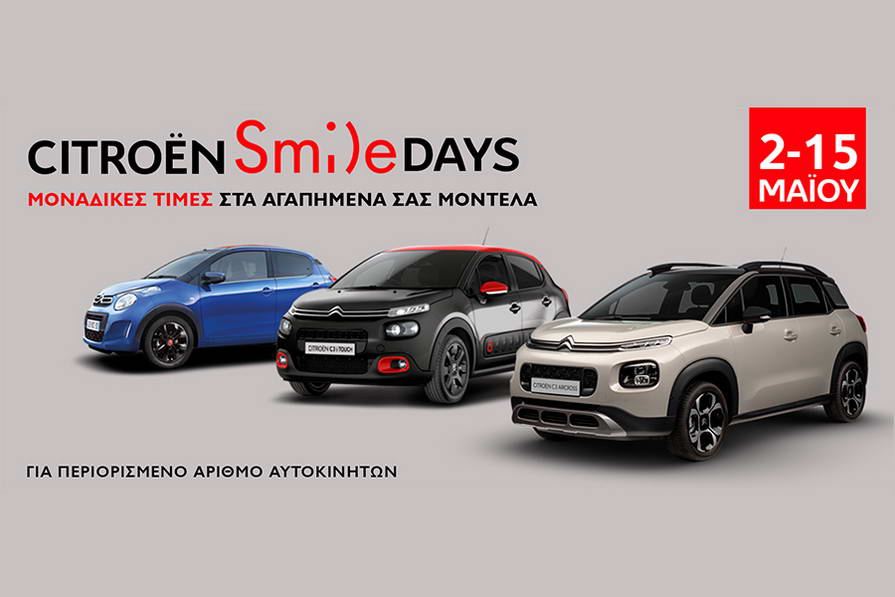 Χαμόγελο: η αξία του, είναι πραγματικά ανεκτίμητη. Τώρα η Citroen το προσφέρει απλόχερα. CITROËN SMILE DAYS, από τις 2 μέχρι τις 15 Μαΐου. Χαμογελάστε ελεύθερα με μοναδικές Τιμές ή ΑΤΟΚΑ χρηματοδοτικά προγράμματα και 5 χρόνια εγγύηση, στα αγαπημένα μοντέλα Citroen.