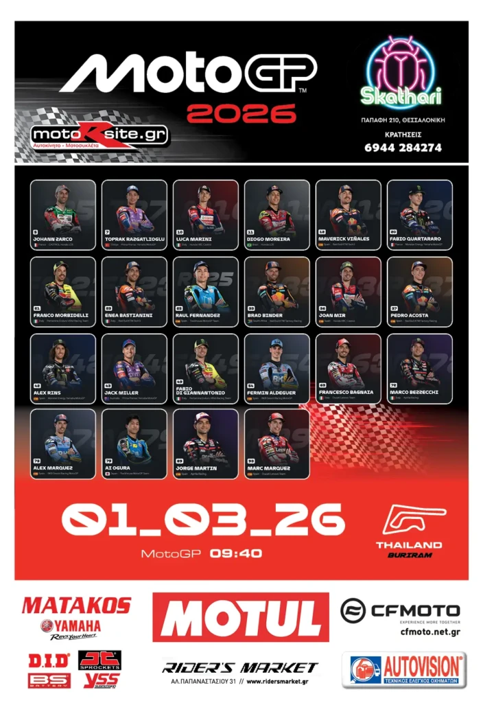 Το υπερθέαμα των δύο τροχών, αρχίζει την Κυριακή 1 Μαρτίου. Το Παγκόσμιο Πρωτάθλημα MotoGP 2026, θα ξεκινήσει αυτή τη φορά με έναν αγώνα στην Ταιλάνδη. Αυτό σημαίνει ότι την ζωντανή μετάδοση της μεγάλης κατηγορίας (λόγω διαφοράς ώρας) θα την δούμε το πρωί της Κυριακής. Όσοι δεν θέλουν να ξυπνήσουν νωρίς την Κυριακή ή Θέλουν να δουν και τις κατηγορίες Μοτο2 και Μοτο3 θα πρέπει να αναζητήσουν την ώρα επανάληψης που θα ορίσει η COSMOTE TV.