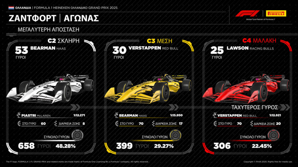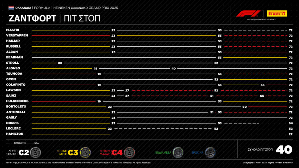 ΜΑRIO ISOLA – ΔΙΕΥΘΥΝΤΗΣ ΜΗΧΑΝΟΚΙΝΗΤΟΥ ΑΘΛΗΤΙΣΜΟΥ ΤΗΣ PIRELLI: «Παρά τις αντίθετες προβλέψεις, αυτό το Grand Prix ήταν συναρπαστικό μέχρι το τέλος, ειδικά λόγω των πολλών εμφανίσεων του αυτοκινήτου ασφαλείας μετά από συγκρούσεις και εγκαταλείψεις. Ο Πιάστρι κέρδισε όχι μόνο επειδή είχε ένα πολύ καλό μονοθέσιο, αλλά και επειδή διαχειρίστηκε τέλεια όλες τις κρίσιμες στιγμές, ειδικά τις τρεις επανεκκινήσεις μετά τις περιόδους του αυτοκινήτου ασφαλείας. Όσον αφορά στα ελαστικά, το πιο θετικό στοιχείο που προέκυψε από αυτό το Σαββατοκύριακο είναι ότι, παρόλο που φέραμε πιο μαλακές γόμες από πέρυσι, και οι τρεις αποδείχθηκαν ανταγωνιστικές στον αγώνα, όπως φαίνεται από τον τρόπο με τον οποίο μοιράστηκαν τα χιλιόμετρα μεταξύ των. Η σκληρή γόμα έκανε το μεγαλύτερο μέρος της δουλειάς, προσφέροντας ένα καλό επίπεδο απόδοσης σε πολύ μεγάλες αποστάσεις, για παράδειγμα οι δύο οδηγοί της Haas κάλυψαν πάνω από τα δύο τρίτα του αγώνα με ένα σετ C2. Αυτή η γόμα συμπεριφέρθηκε καλύτερα από ό,τι στις τρεις ελεύθερες δοκιμές, έτσι ώστε οι οδηγοί να πιέσουν αμέσως μετά τις επανεκκινήσεις. Έτσι, όσοι, όπως οι οδηγοί της McLaren και της Aston Martin, είχαν καταφέρει να κρατήσουν και τα δύο σετ για τον αγώνα, μπόρεσαν να επωφεληθούν από αυτό. Όσον αφορά στη μέση και στη μαλακή γόμα, η απόδοσή τους ήταν αρκετά παρόμοια, κάτι που είναι σημαντικό, ειδικά στην περίπτωση της πιο μαλακής από τις δύο. Τώρα προχωράμε στο εντός έδρας Grand Prix της Pirelli, όπου θα γιορτάσουμε με όλους τους φιλάθλους το ορόσημο που φτάσαμε σήμερα, δηλαδή τις 500 συμμετοχές σε Grand Prix της Formula 1. Είμαστε ο προμηθευτής ελαστικών με τις περισσότερες εμφανίσεις στην κορυφαία κατηγορία του μηχανοκίνητου αθλητισμού. Είμαστε περήφανοι γι’ αυτό, που αποτελεί απόρροια του πάθους, της τεχνογνωσίας και της δέσμευσης που έχουν επιδείξει τόσοι πολλοί άνδρες και γυναίκες που εργάζονται στην Pirelli από τη δεκαετία του 1950. Θα αρχίσουμε να μετράμε ξανά από τη Μόντσα»!
