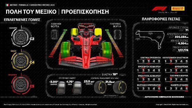 Η χρήση των δύο πιο μαλακών γομών θα αξιολογηθεί σίγουρα προσεκτικά κατά τη διάρκεια των τριών περιόδων ελεύθερων δοκιμών, όταν οι ομάδες θα είναι σε θέση να πραγματοποιήσουν μεγάλα stint με πλήρη φορτία καυσίμου και να ελέγξουν την κατάσταση των ελαστικών. Ιστορικά, τα επίπεδα θερμικής παραμόρφωσης (graining) στο Μεξικό είναι αρκετά έντονα, καθώς ο αραιός αέρας λόγω του υψομέτρου μειώνει την αεροδυναμική κάθετη δύναμη (downforce) που μπορούν να παράγουν τα μονοθέσια. Σε μια πίστα που ήδη υστερεί σε πρόσφυση λόγω της περιορισμένης χρήσης της, τα ελαστικά τείνουν να γλιστρούν, γεγονός που επιτείνει το φαινόμενο παραμόρφωσης (graining). Θα έχει επίσης ενδιαφέρον να δούμε εάν η μεγαλύτερη αντίσταση σε αυτό το φαινόμενο που προσφέρουν οι τρέχουσες γόμες θα βοηθήσει στον περιορισμό του και, επομένως, θα ωφελήσει εκείνους που είναι πιο ικανοί στη διαχείριση των ελαστικών.