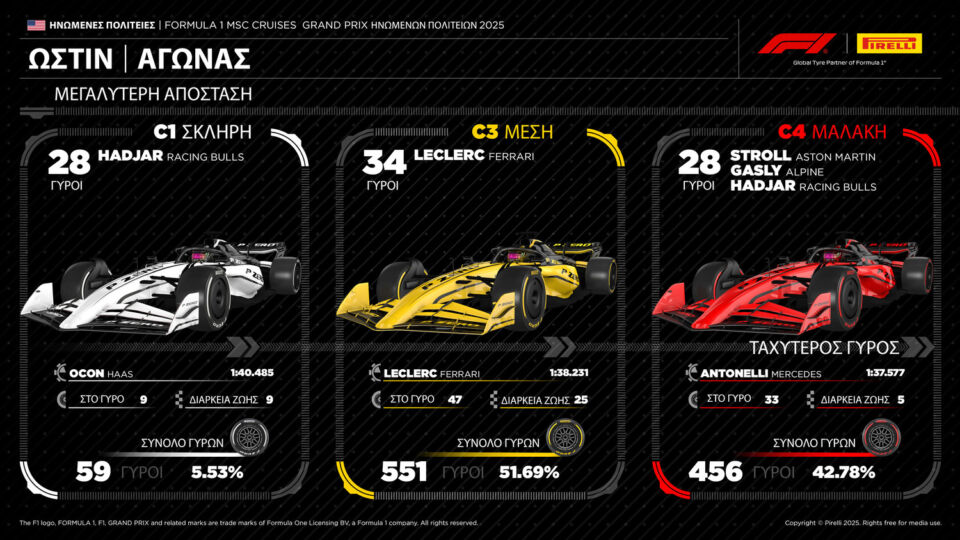 Ο Max Verstappen με τη Red Bull έγινε ο πρώτος οδηγός που κερδίζει επτά Grand Prix στις Ηνωμένες Πολιτείες. Αυτή ήταν η τέταρτη νίκη του στην πίστα COTA όπου μια μέρα νωρίτερα είχε κερδίσει και στον αγώνα Sprint. Ως αποτέλεσμα, βρίσκεται τώρα, μόλις 40 βαθμούς πίσω από την κορυφή της βαθμολογίας, με πέντε Grand Prix και δύο αγώνες Sprint να απομένουν φέτος. Όπως οι περισσότεροι οδηγοί, ο Verstappen επέλεξε μια στρατηγική μέσης/μαλακής γόμας. Χρειάζονταν βέλτιστη διαχείριση καθώς η άσφαλτος που έχει ανομοιομορφίες έφτασε σε θερμοκρασία 47 βαθμών Κελσίου. Την κατάσταση δυσκόλευαν περαιτέρω οι ριπές ανέμου. Η ένταση στα ελαστικά μειώθηκε ελαφρώς κατά τη διάρκεια της υιοθέτησης εικονικού αυτοκινήτου ασφαλείας (Virtual Safety Car) νωρίς στον αγώνα, καθώς επιβράδυνε τον ρυθμό σε ένα κρίσιμο σημείο, με τα μονοθέσια γεμάτα καύσιμα. Η βασική διαφοροποίηση όσον αφορά στη στρατηγική ήρθε από το Charles Leclerc με τη Ferrari: ήταν ο μόνος οδηγός από τους πρώτους 15 που εκκίνησε με μαλακή γόμα. Χρησιμοποίησε την επιπλέον πρόσφυση με εξαιρετικό τρόπο, διεκδικώντας την πρωτοπορία στην πρώτη στροφή από την τρίτη θέση της εκκίνησης.