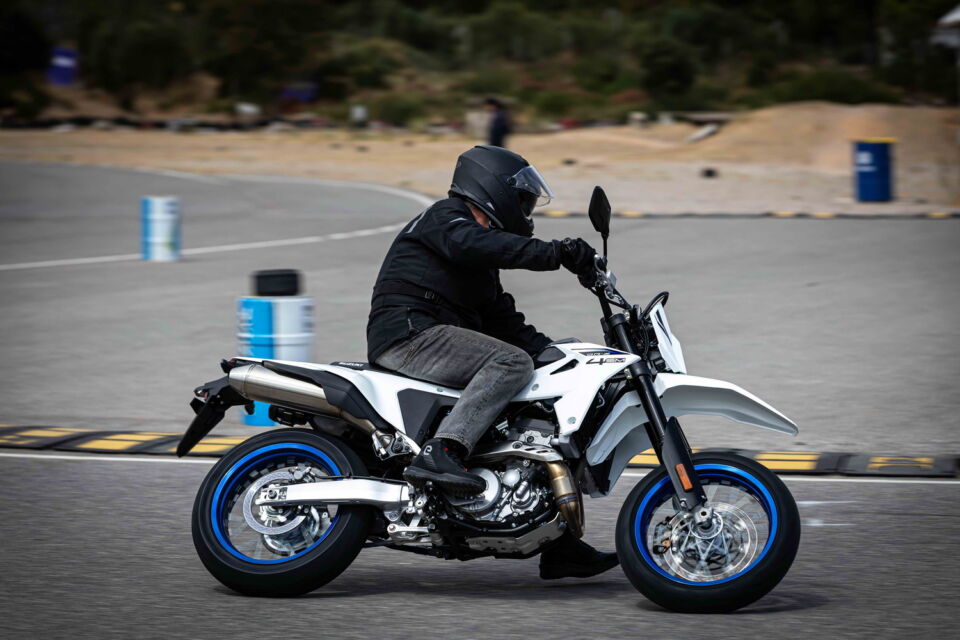 Αμφότερα τα μοντέλα έχουν αλουμινένιους τροχούς με ακτίνες, αλλά η διάμετρός τους και ο τύπος των ελαστικών φυσικά διαφέρουν. H έκδοση S φοράει 21 ίντσες μπροστά (80/100-21) και 18 (120/80-18) πίσω με ελαστικά IRC GP-410, ενώ η διάμετρος των τροχών του SM είναι στις 17 ίντσες (120/70 – 140/70) και ελαστικά τα Dunlop Sportmax Q5A. Οι αναρτήσεις της KYB προσφέρουν διαφορετικές διαδρομές και οι ρυθμίσεις τους είναι ανάλογες με το μοντέλο. Το εντουράδικο S έχει διαδρομή 280mm μπροστά και 296 πίσω, ενώ το στρητάδικο SM είναι πιο χαμηλό με διαδρομή 260mm μπροστά και 277 πίσω.
