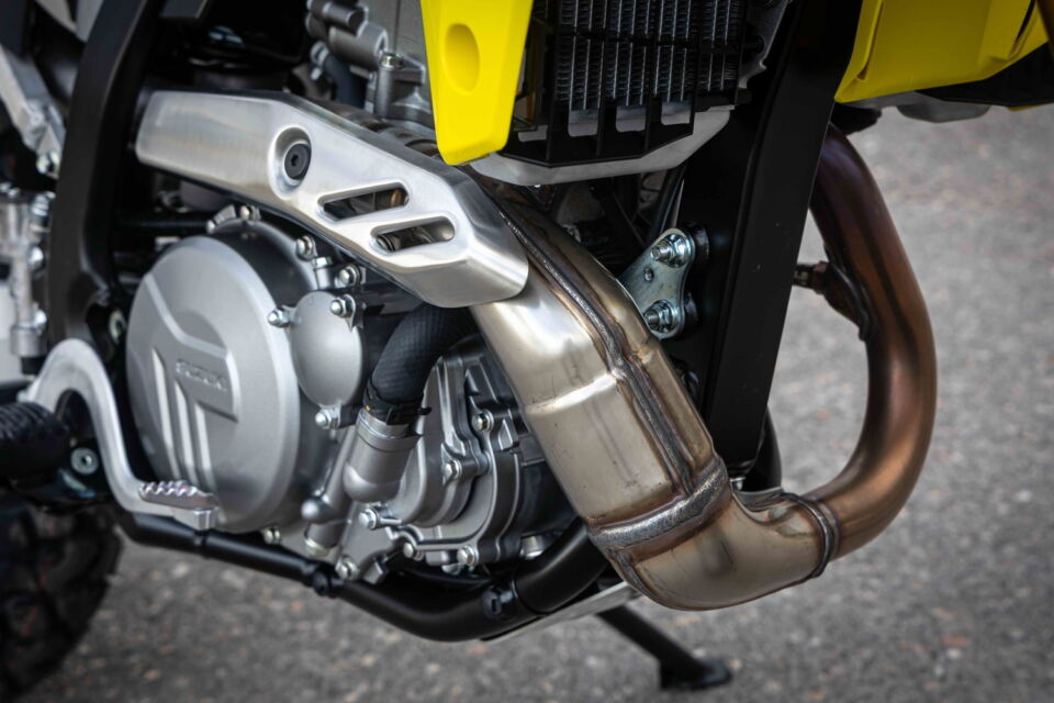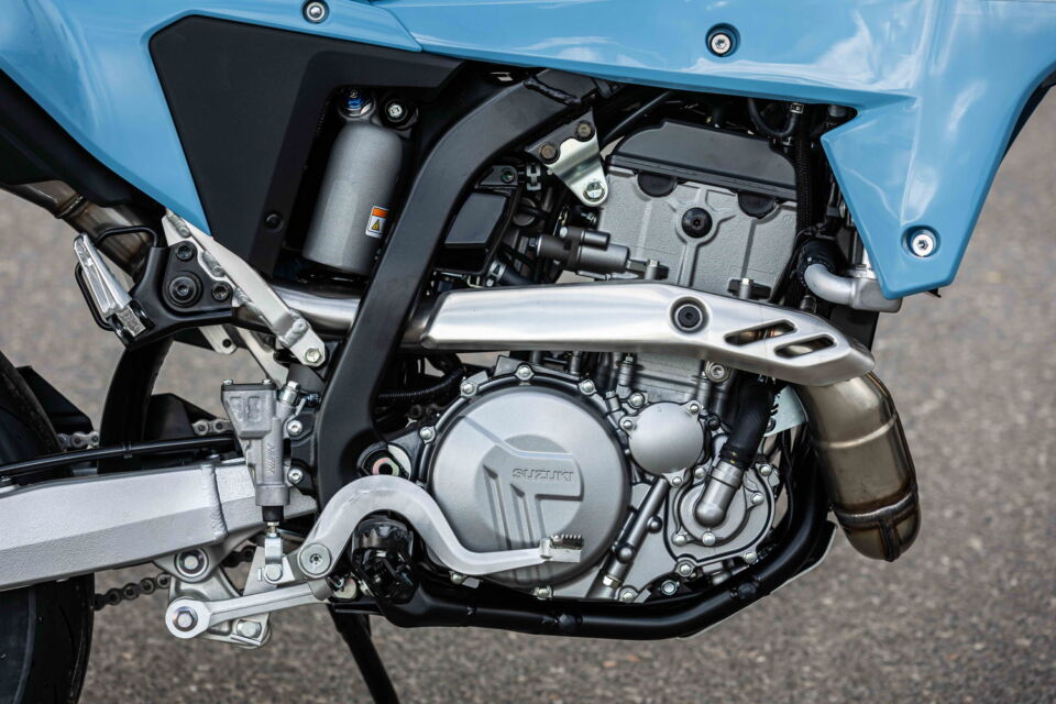 Όλα έχουν αλλάξει πάνω στον γνωστό μας αλεξίσφαιρο κινητήρα που φορούσε το πολυαγαπημένο DR-Z400 τη δεκαετία του 2000. Οι εκκεντροφόροι έχουν νέο προφίλ, υπάρχει σκληρή επίστρωση στο χιτώνιο, νέο είναι το πιστόνι, η κεφαλή, που έχει πλέον δυο μπουζί, νέο και το κάρτερ, αλλά και ο υποβοηθούμενος συμπλέκτης περιορισμένης ολίσθησης και οι βαλβίδες εισαγωγής τιτανίου. Οι εισαγωγές αέρα, το σχήμα του θαλάμου καύσης και η εξάτμιση με τα διπλά τοιχώματα (για χαμηλότερα επίπεδα εκπομπής θερμότητας) έχουν σχεδιαστεί έτσι ώστε να προσαρμόσουν το σύνολο στις απαιτήσεις των Eruro5+ προδιαγραφών. Ο ψεκασμός έχει διάμετρο 42mm με ηλεκτρονικά ελεγχόμενη βαλβίδα και συνεργάζεται με νέο φιλτροκούτι και εξάτμιση. Ε, δεν έμεινε και τίποτα, όλα αλλάχτηκαν! Μάλλον όχι όλα, το 5αρι κιβώτιο παραμένει στη θέση του καθόσον δεν κρίθηκε αναγκαίο να γίνουν επεμβάσεις.