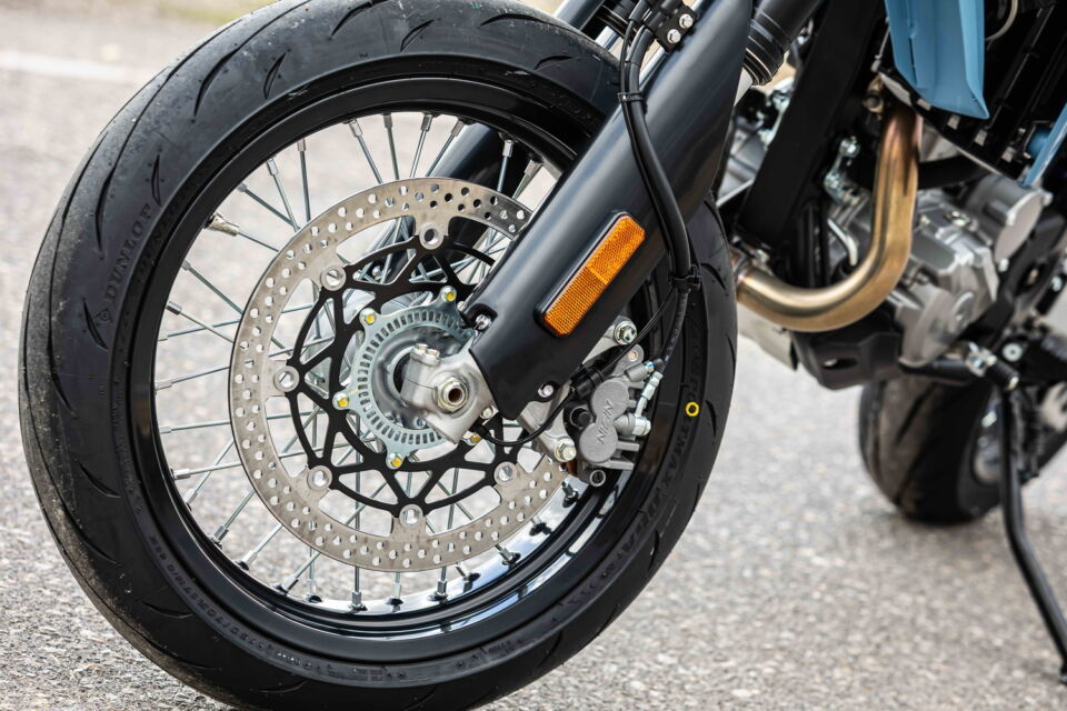 Τα φρένα της Nissin αφορούν σε δισκόφρενα με διπίστονη δαγκάνα μπροστά (S 270mm / SM 310mm) και δίσκο 240mm με δαγκάνα ενός εμβόλου πίσω. Το ABS μπορεί να απενεργοποιηθεί στο μπροστινό ή στον πίσω ή και στους δύο τροχούς στο “χωμάτινο” μοντέλο και μόνο στον πίσω στο supermotο.