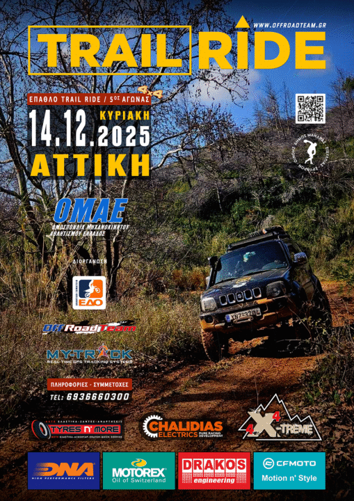 Στις 14 Δεκεμβρίου, το 4ο αγωνιστικό Trail Ride για μοτοσυκλέτες και το 5ο για τα 4Χ4 θα πραγματοποιηθεί στην Μάνδρα Αττικής! Παράλληλα, μια φιλική βόλτα με μοτοσυκλέτες, αυτοκίνητα 4Χ4 και Quad μας περιμένει!